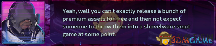 3、一名海盜在教程中提到“你不能完全免費(fèi)釋放premium assets(我總覺得他是在暗示p站),又不希望有人在某個時候?qū)⑺鼈內(nèi)舆M(jìn)鏟子黑社會游戲(shovelware smut game,這個梗我有點摸不著頭腦,期待有達(dá)人能揭曉)中。”