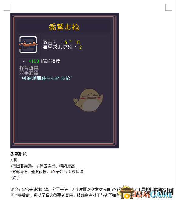 在《Dungreed》的世界中,禿鷲步槍以其卓越的性能成為了玩家們爭相擁有的神器。它不僅能夠精準(zhǔn)鎖定目標(biāo),射程遠達,更是以四連發(fā)的獨特射擊模式,為戰(zhàn)斗增添了無限可能。現(xiàn)在,就讓我們跟隨“奇酷上傳”的腳步,深入解析這款令人矚目的禿鷲步槍,一探究竟!