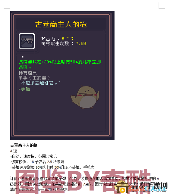在《Dungreed》的武器庫中,古董商主人的槍以其獨(dú)特的裝填機(jī)制和強(qiáng)大的輸出能力,成為玩家們爭相追捧的單手武器。裝填點(diǎn)數(shù)超過30%時,它便能以50%的幾率瞬間完成裝填,極大地提升了戰(zhàn)斗效率。今天,就讓我們跟隨“奇酷上傳”的步伐,一探究竟,揭開這把神秘槍械的神秘面紗。